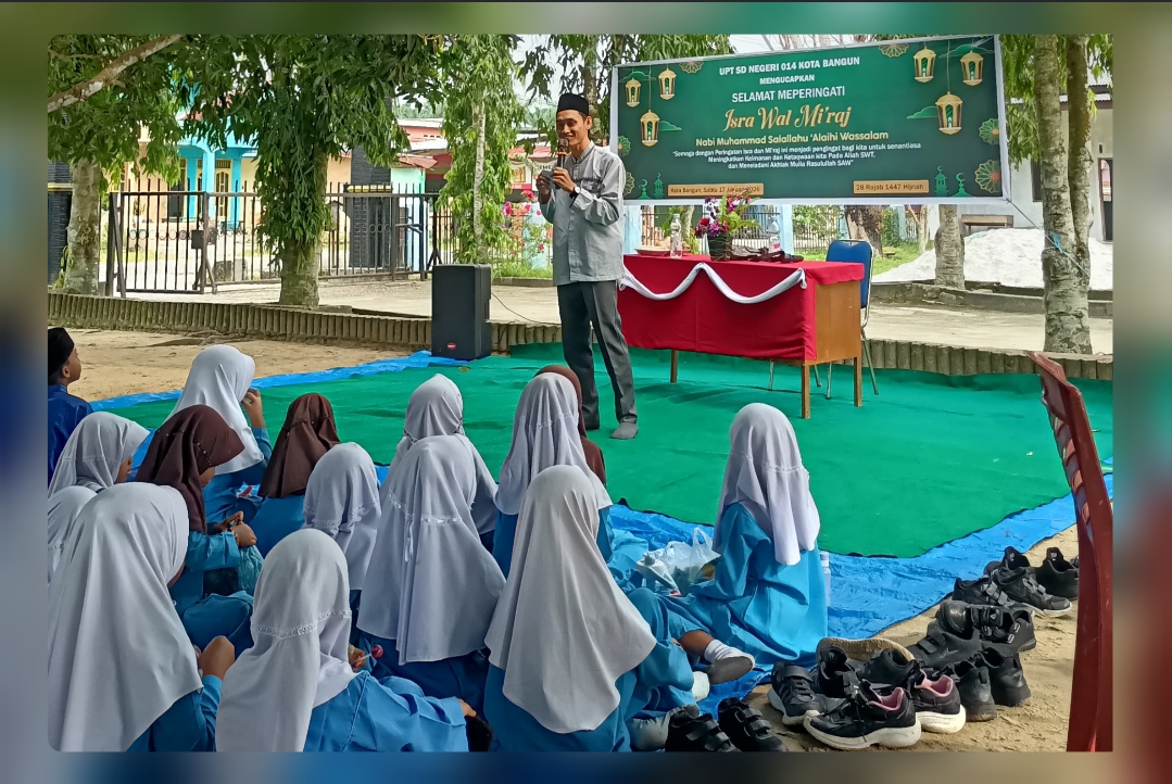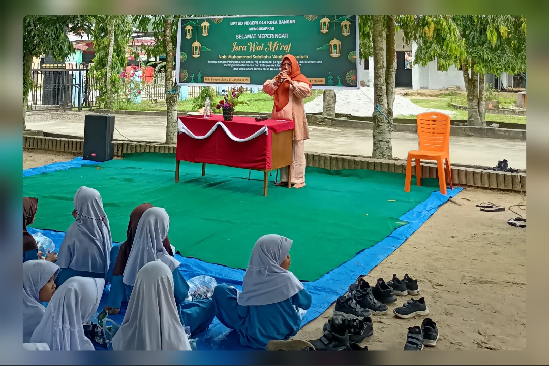 Tapung Hilir, Redaksi86.com — UPT SDN 014 Kota Bangun melaksanakan peringatan Isra dan Mi’raj Nabi Muhammad SAW 27 Rajab 1447 Hijriah pada Sabtu (17/01/2026). Kegiatan keagamaan tersebut dimulai pukul 08.00 WIB dan berlangsung hingga pukul 11.00 WIB di halaman sekolah, dengan suasana sejuk di bawah rindangnya pepohonan.