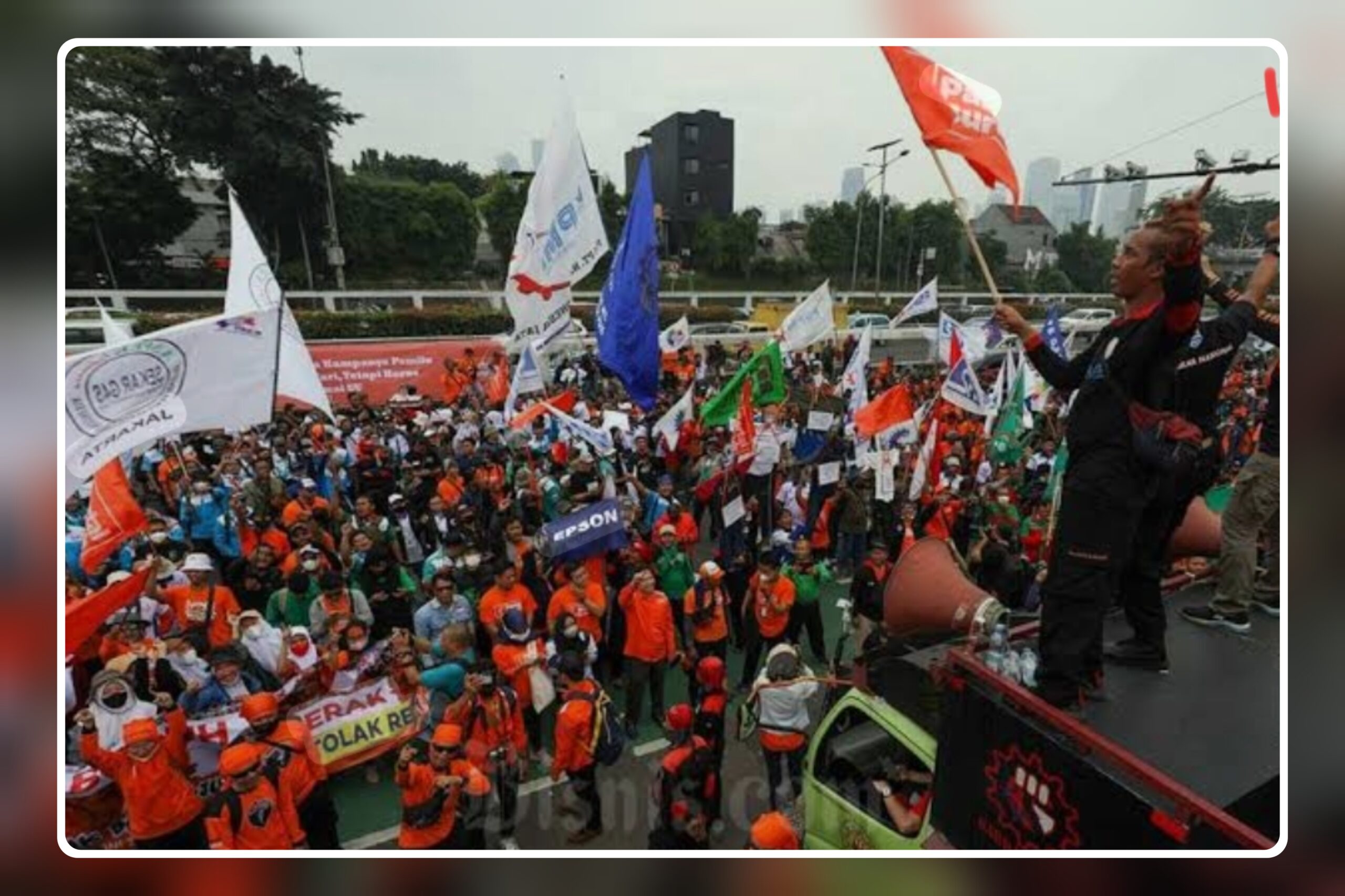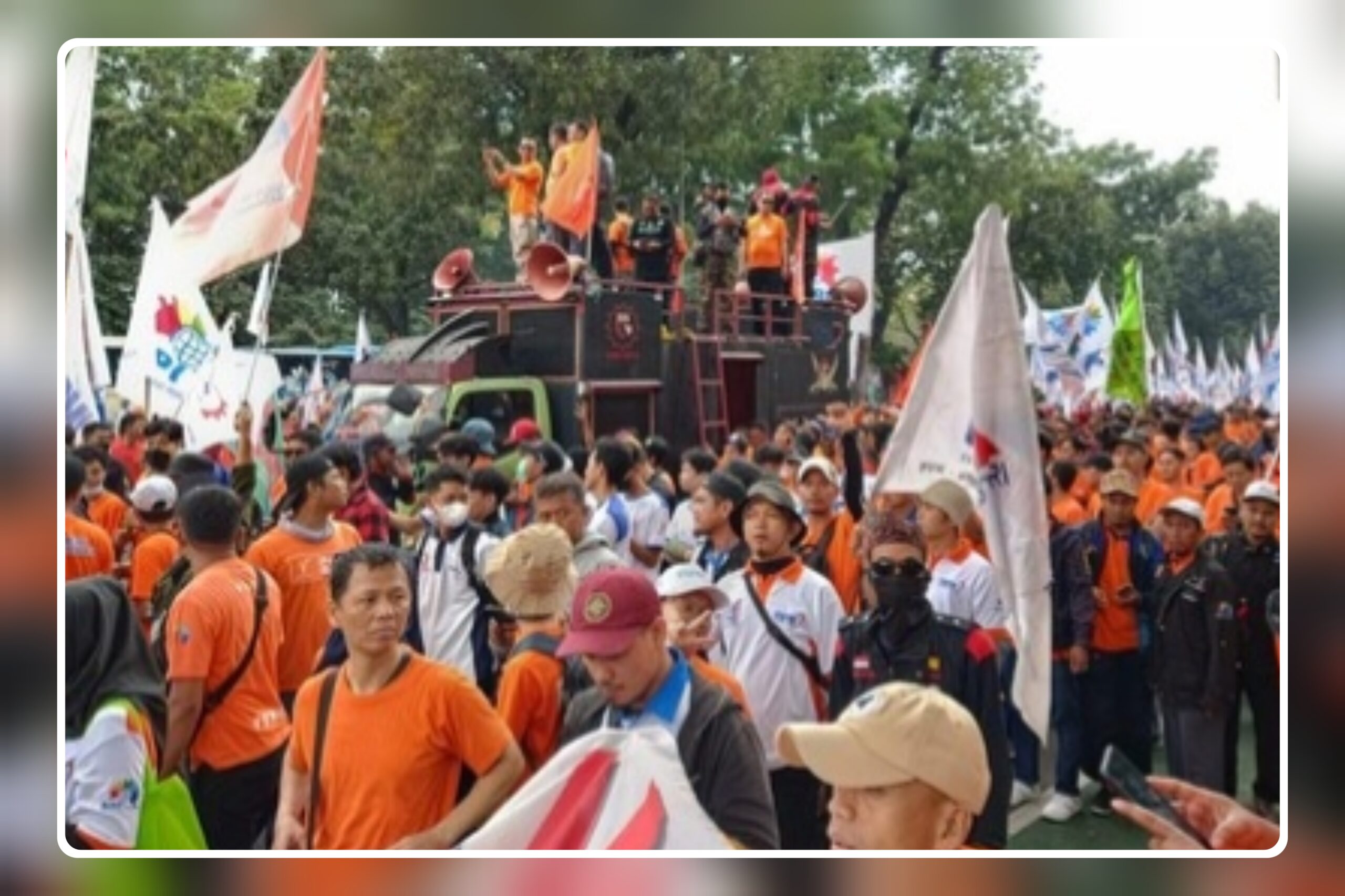 “Enak aja, kita yang kerja, kita yang bayar pajak buat negara, kita cinta dengan Presiden Prabowo, kita cinta dengan Republik ini, kita cinta keluarga kita. Tapi mereka mengukur-ngukur perut kita hanya naik 9 US Dollar per bulan,” tegas Said disambut sorakan massa.