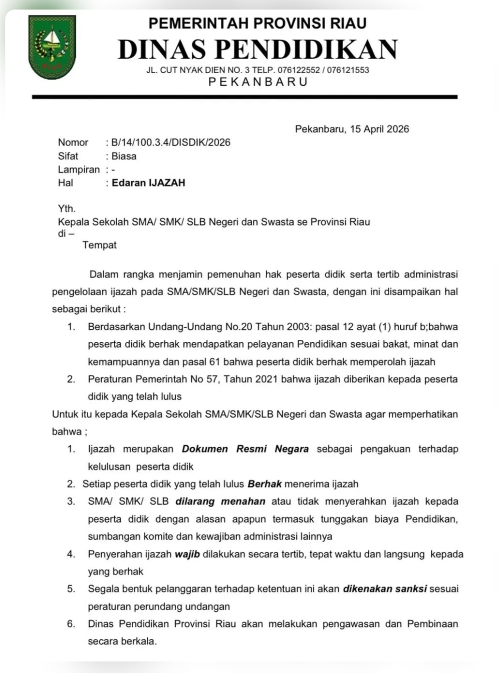 PEKANBARU, Redaksi86.com – Dinas Pendidikan Provinsi Riau resmi mengeluarkan kebijakan tegas terkait penahanan ijazah siswa. Melalui surat edaran terbaru, seluruh sekolah tingkat SMA, SMK, dan SLB. Baik negeri maupun swasta dilarang menahan ijazah dengan alasan apa pun.